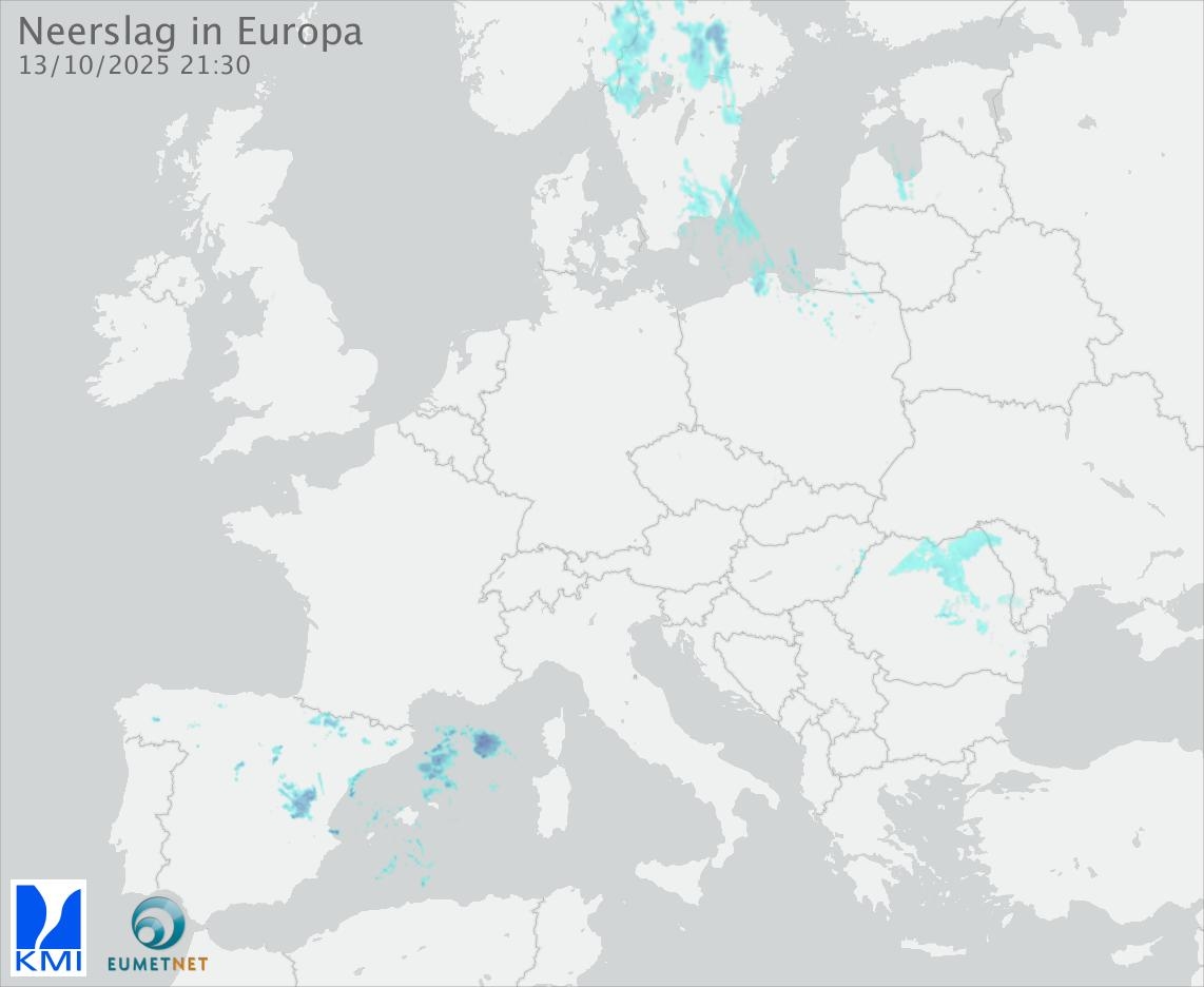 Deze animatie toont de gevallen neerslag waargenomen door de europese radars van de deelnemers aan het OPERA-programma van Eumetnet, per stappen van 15 minuten.