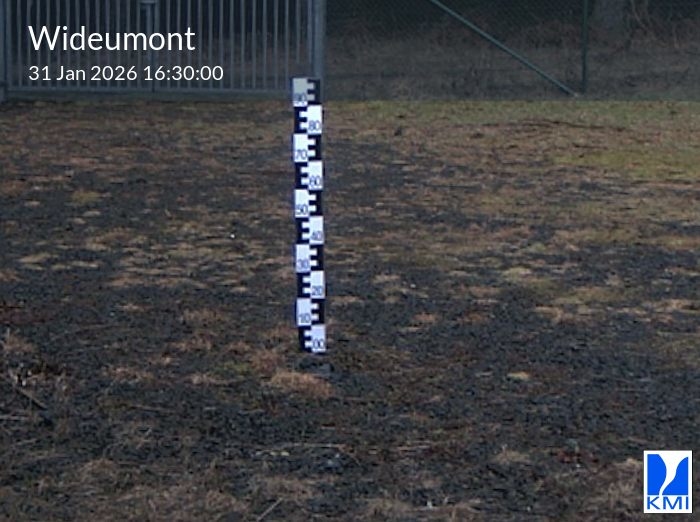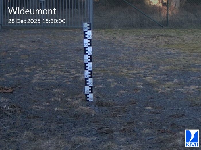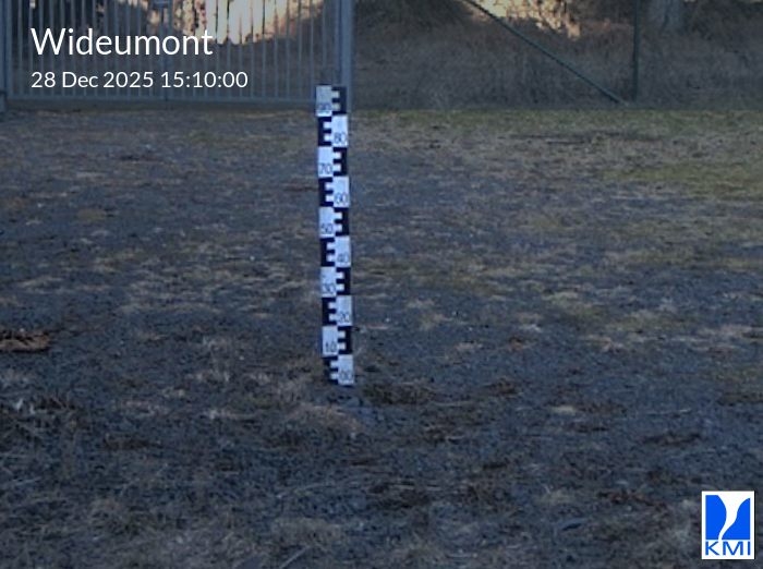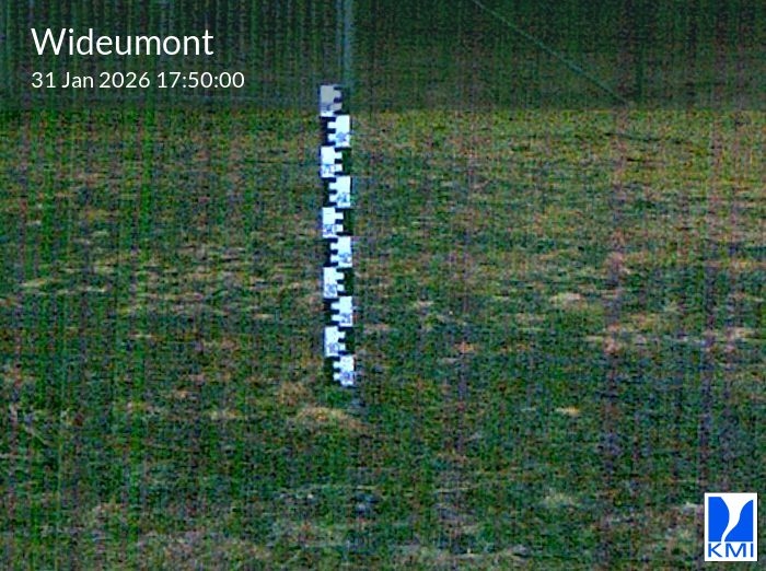 De meetlat op het beeld laat toe om de actuele sneeuwhoogte (in cm) in te schatten.